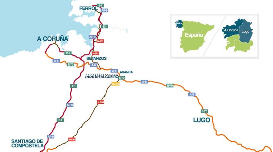El ámbito tiene una extensión superficial de 32,3 Has y está situado en un contexto dominado por la existencia de vías de comunicación de gran importancia estratégica, como la ya mencionada autovía A-6 o autovía del noroeste, la carretera nacional N-VI, la carretera autonómica AC-230 y la AC-151 que atraviesa el sector para unir Montesalgueiro y Monfero. |
